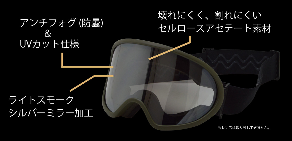 ●モーターサイクル専用ゴーグル ●CE規格適合品 ●曇り止め加工レンズ ●シルバーミラー加工レンズ ●UVカットレンズ ●メガネ対応※ ●滑り止めシリコン付きベルト ●オプションベルト5種