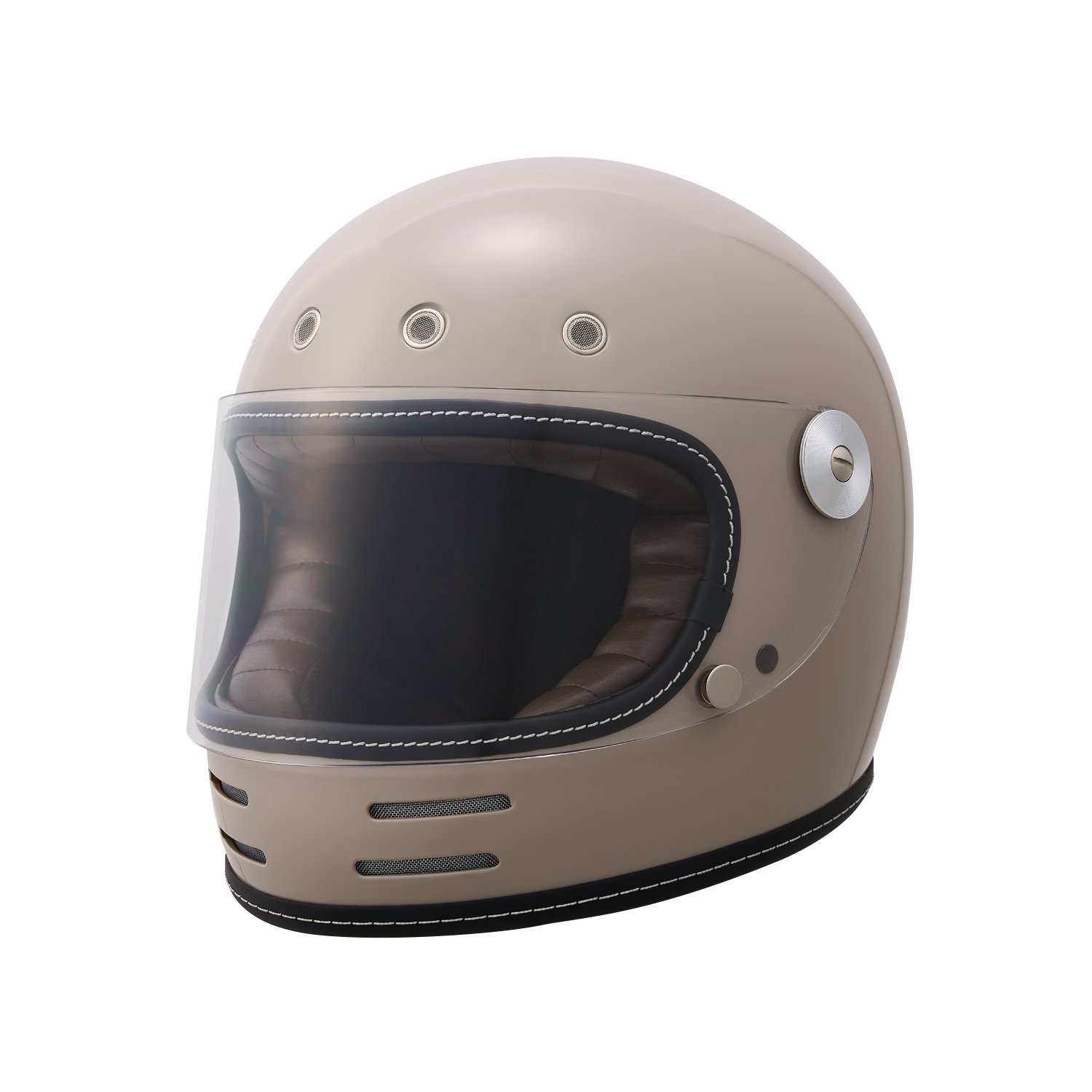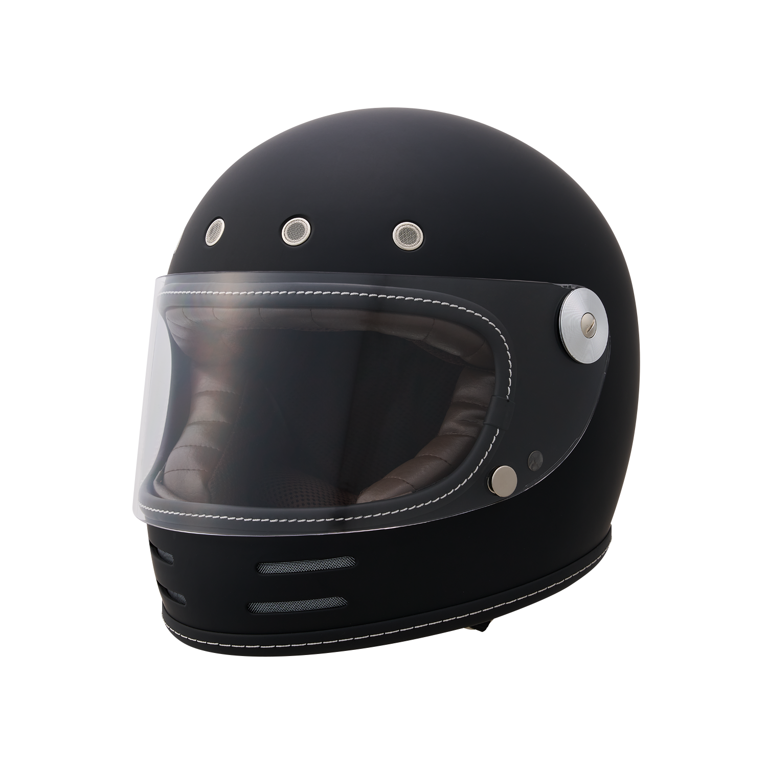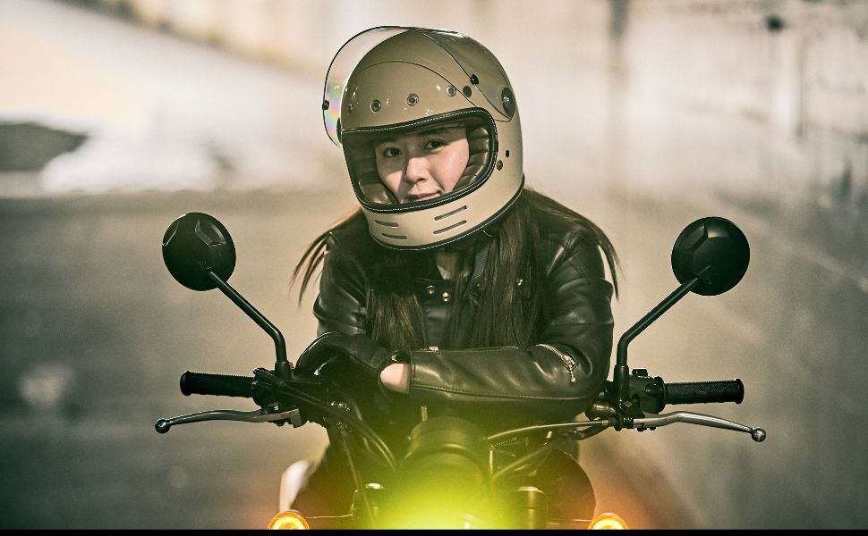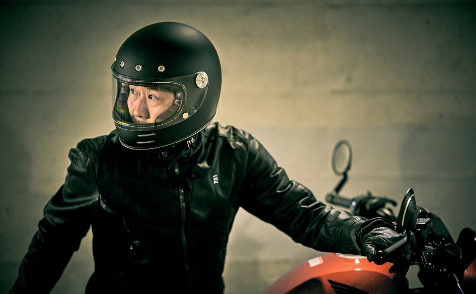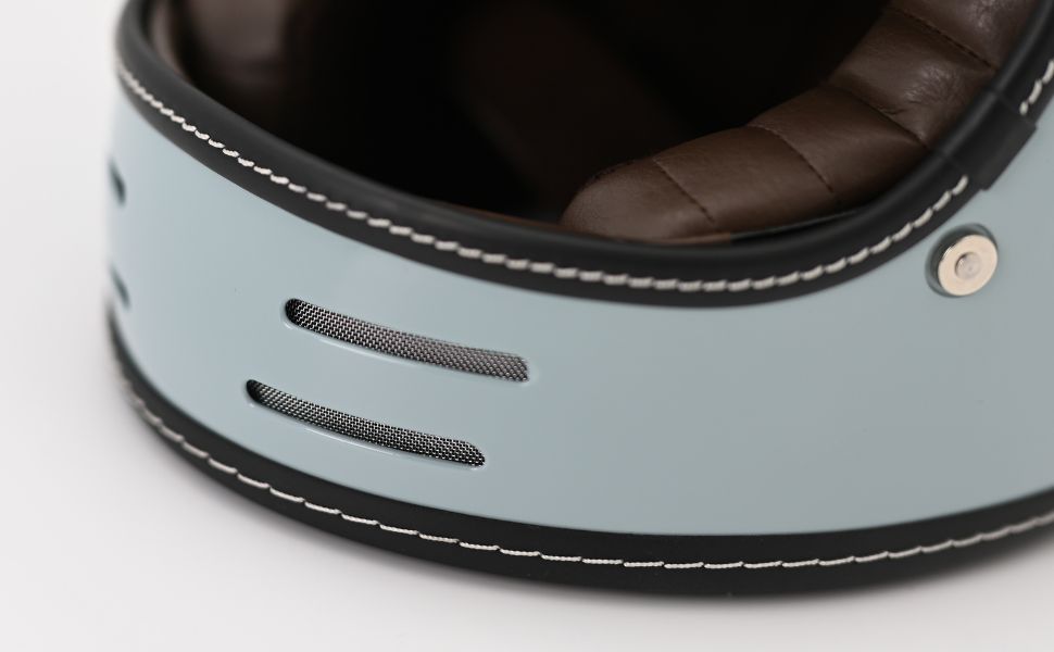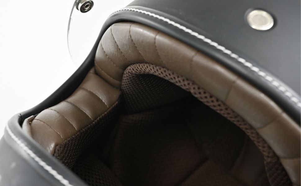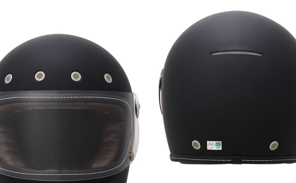 フローティングマグネット機構、アルミ削り出し風シールドホルダー、タックロール調のブラウン内装など、ディテールと実用性にこだわり抜いたネオレトロフルフェイスヘルメット。